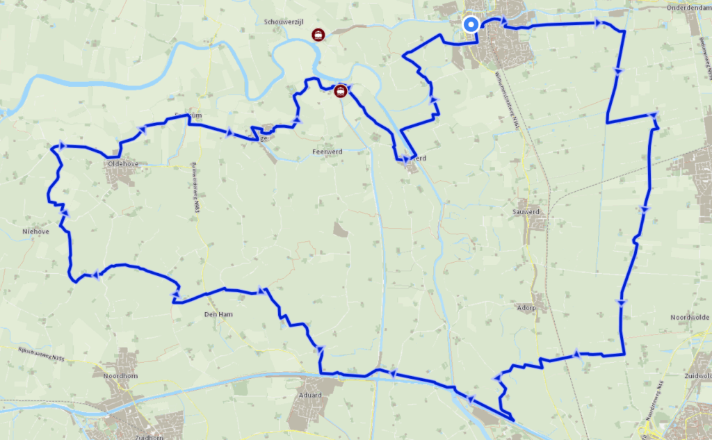 Plaatsen waar je doorheen fietst: Adorp, Aduard, Bedum, Den Ham, Ezinge, Feerwerd, Garnwerd, Groningen, Niehove, Noordwolde, Oldehove, Saaksum, Wierum, Winsum