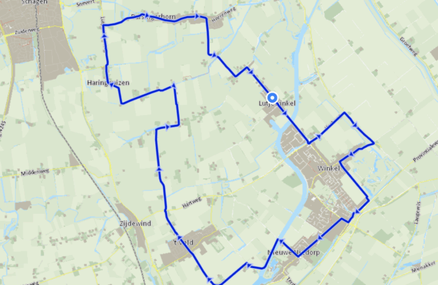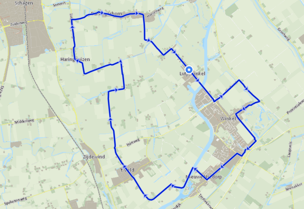 Plaatsen waar je doorheen fietst: 't Veld, Barsingerhorn, Haringhuizen, Lutjewinkel, Nieuwe Niedorp, Schagen, Winkel