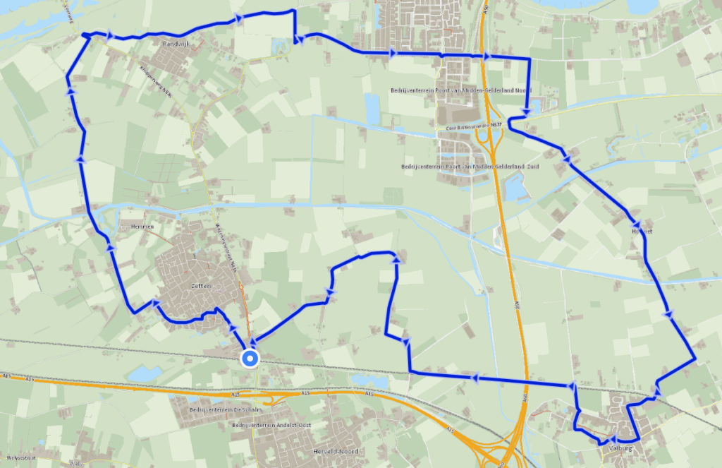 Plaatsen waar je doorheen fietst: Elst, Hemmen, Herveld, Heteren, Randwijk, Valburg, Zetten