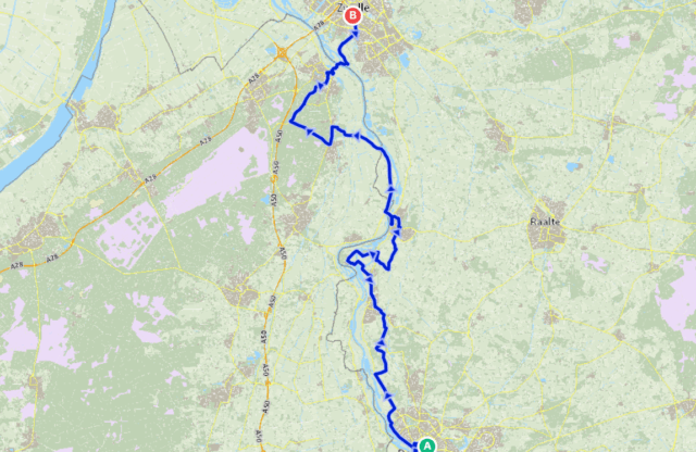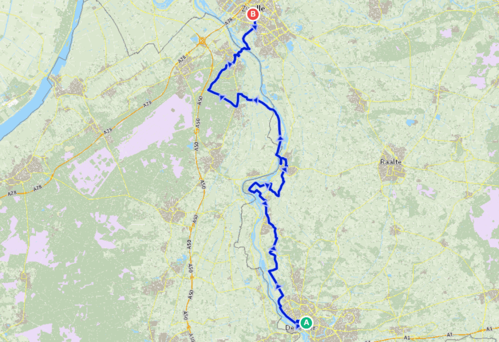 Plaatsen waar je doorheen fietst: Deventer, Diepenveen, Hattem, Marle, Olst, Vorchten, Wapenveld, Wijhe, Zwolle