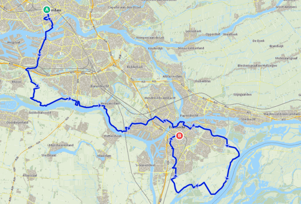 De route gaat van het treinstation in Rotterdam naar Dordrecht. Je kunt de route afkorten door de lus over het Eiland van Dordrecht over te slaan. Ook is het een optie om in Dordrecht de Waterbus terug naar Rotterdam te nemen. De fiets mag gratis aan boord. Rotterdam presenteert zich als de architectuurstad van Nederland. Op de route zie je het Museumpark, de Erasmusbrug en de hoogbouw van de Wilhelminapier. Via de Maastunnel ga je de Nieuwe Maas onder. Er is hier een lift, dus je hoeft niet over de roltrap. Al snel ben je op schiereiland IJsselmonde, waar polders en getijdengrienden in elkaar overgaan. De Jan Gerritsepolder aan de Oude Maas is verontreinigd door slib uit de Rotterdamse Haven, toch fiets je er nu stilletjes tussen jonge bossen met veel water. Op de heuvel weerspiegelt het kunstwerk Sky, Moon, Mirror, Environment de omgeving, die alsmaar blijft veranderen. In Zwijndrecht neem je de Waterbus naar Dordrecht, met zijn schitterende historische havens en smalle straten vol oude gevels. Hierna volgt een rondje over het Eiland van Dordrecht. Langs het Wantij en de Nieuwe Meerwede gaat de route naar de Nieuwe Dordtse Biesbosch, een watervogel-eldorado.